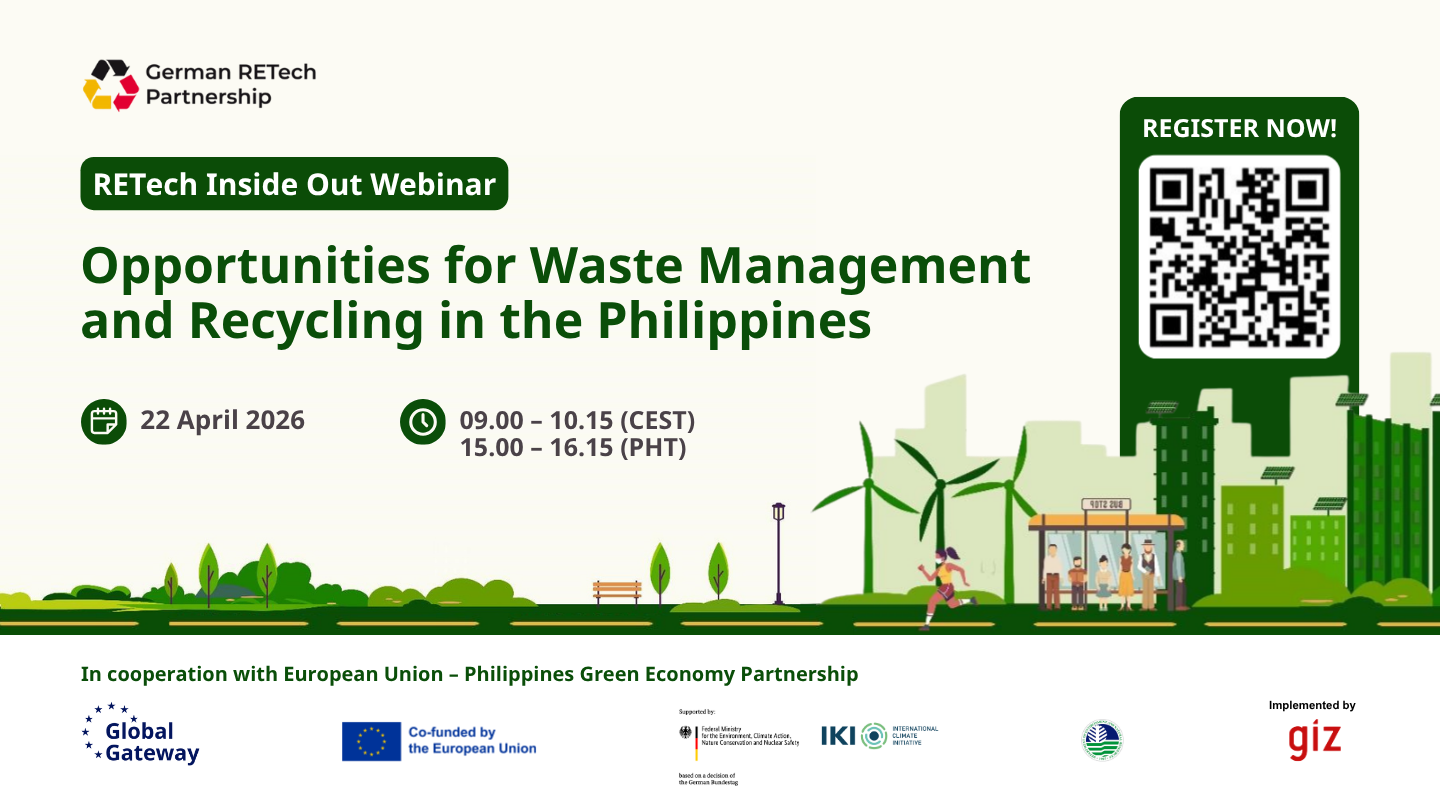 Join us for "Opportunities for Waste Management and Recycling in the Philippines" webinar hosted by the German RETech Partnership in collaboration with the European Union-Philippines Green Economy Partnership.
